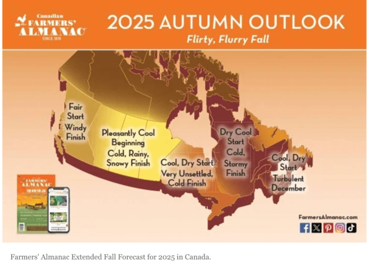 根据最新发布的《农民年鉴》2025年秋季预测,安省即将迎来一个充满“戏剧性”的秋天。该机构的长期预测显示,九月初天气宜人干燥,但自十月中旬开始,剧烈天气系统将轮番登场。**这不仅意味着频繁的降雨和雷暴,更预示着寒潮提早登场,特别是在北部地区,降雪将早于往年。