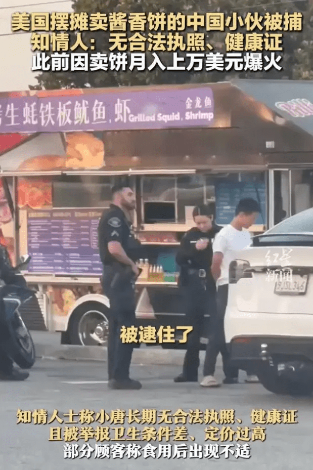 7月18日晚,小唐在洛杉矶摆摊时被捕,罪名包括无证经营、违反限制令、甚至疑似教唆非法移民。据悉,此前一位曾与他合伙的华人女性举报他“持续骚扰”和“健康违法”,成功取得法院限制令。他却依旧上门“讨要设备”,最终被警方带走。美国移民局也在同步调查其身份是否合法,小唐的“绿卡梦”可能因此断送。
