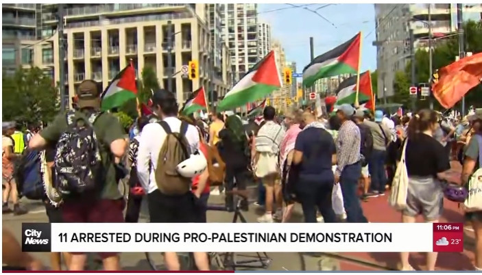 加拿大最大城市多伦多上周末爆发针对以色列政策的抗议行动。大批亲巴勒斯坦示威者占据市中心主要交通枢纽,在警方试图驱散过程中爆发冲突,11人因涉嫌袭警与非法集会被捕。