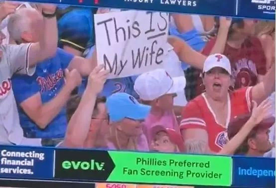 当然也有观众反其道而行之,举着“This IS my wife”的牌子,IS大写,表示“这真是我老婆,我真可以亲”…