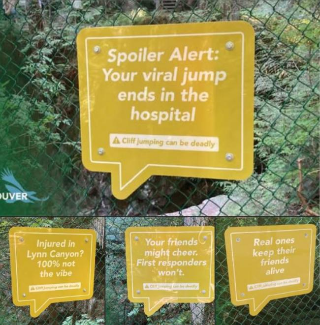 上周,北温哥华区政府在林恩峡谷内的多处入口和热门悬崖区域新增了数个警告标识,试图用更贴近社交媒体世代语言的方式劝阻冒险行为。其中一块写道:“真friends是不会让朋友送死的”;另一块则讽刺道:“剧透:可以疯传的跳水画面,会把你送进医院。”警告语句轻松中带刺,语气玩笑但内容严肃——“在悬崖跳水可能致命”这句作为结尾被反复强调。