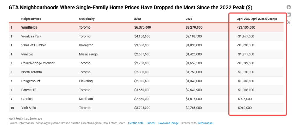 根据加拿大房地产平台 Wahi 最新公布的数据显示,从2022年4月市场高点至2025年4月,GTA有超过八成社区的独立屋房价出现下跌,其中多个社区跌幅超过40%,甚至腰斩。