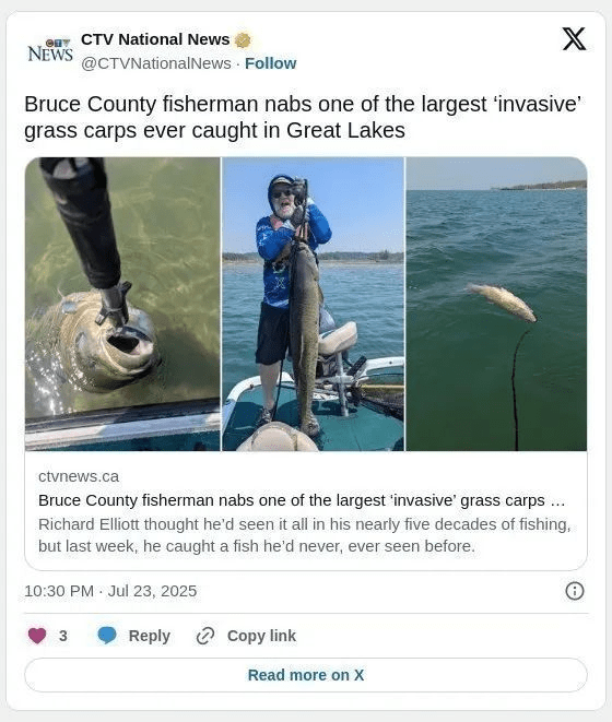 当理查德·埃利奥特(Richard Elliott)在安省布鲁斯半岛附近钓上那条长达1.2米、重逾25公斤的草鱼时,他并没有高兴太久。“65年来,我从未见过这种鱼。我希望自己也从没见过。”他对CTV表示。他意识到,自己并不是钓到了一条“大鱼”,而是意外卷入了一场生态战役的前线。