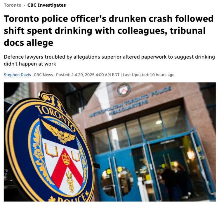 2023 年 1 月的一个冬夜,一起看似普通的交通事故成为多伦多警局“纪律破窗”的关键节点。一名警员醉驾撞车被捕,其上司却因此面临更加沉重的指控 —— 值班期间带队饮酒、篡改出勤记录、企图误导调查。事发一年半之后,这起原本已尘埃落定的案件,重新揭开了警察系统背后的“沉默共谋”。