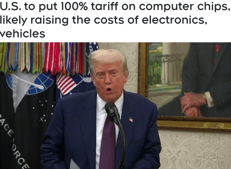 在白宫椭圆形办公室与苹果CEO蒂姆·库克会面时,特朗普直接表示:“我们将对芯片和半导体征收大约100%的关税。但如果你是在美国产的,那就不用交。”一句话点明了政策核心:凡属“美国制造”者可豁免,其余皆为征税对象。