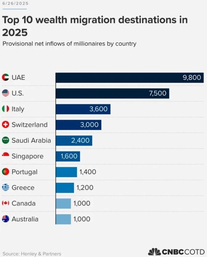 但加拿大并不是唯一的赢家。阿联酋今年预计将迎来9800名富人,美国7500名,意大利3600名。与此同时,英国、印度和中国等国则面临高净值人口的净流失。专家认为,这一趋势将重塑全球房地产市场、创业生态和就业格局。