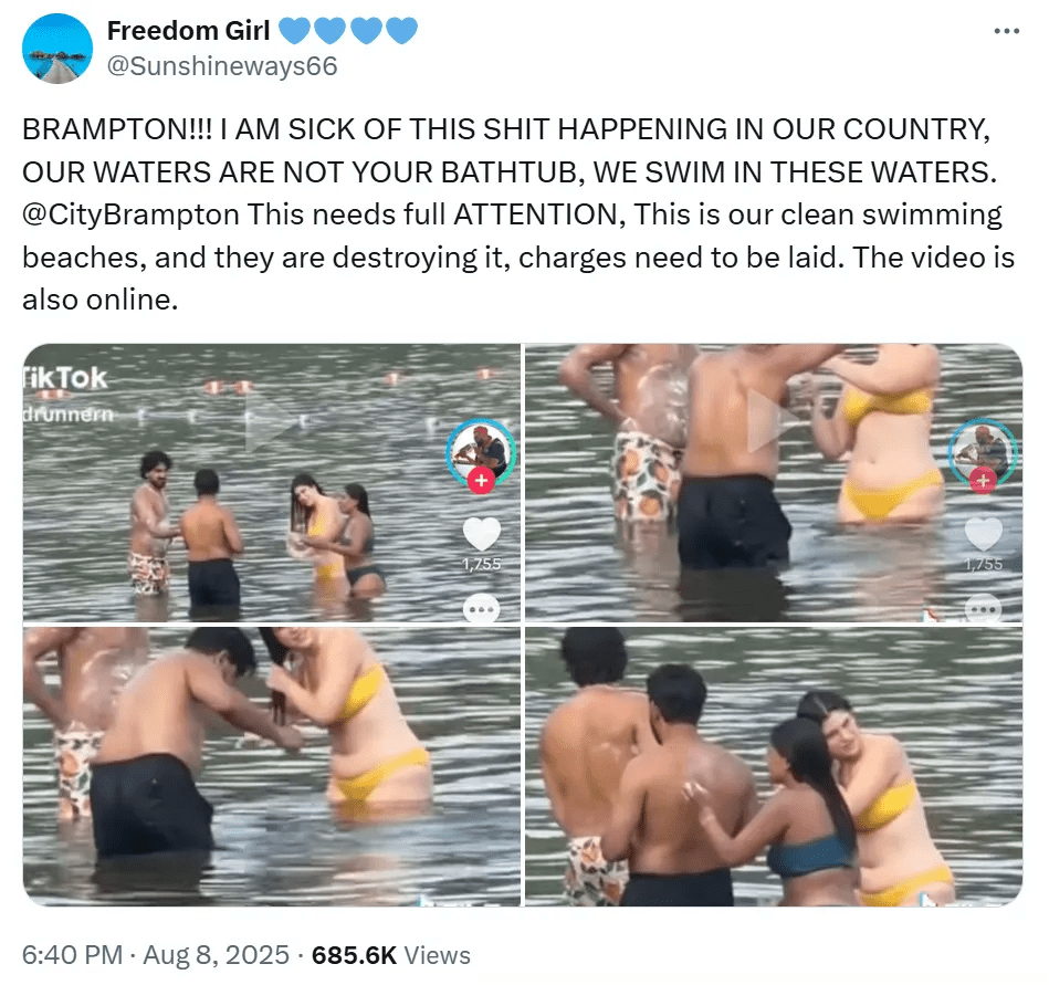 在卫生警报频发之际,一段拍摄于安省湖泊的视频近日在社交媒体流传,成为舆论焦点。画面中,几名南亚裔男女在公共湖水中使用肥皂搓背、洗头,甚至清洗私密部位,举止毫不避讳其他游客。视频发布后迅速引发数以万计的评论,不少网友将湖水污染与此类行为直接挂钩,甚至出现带有种族色彩的指责。