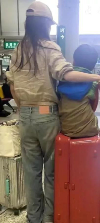 除了这个之外,杨颖还拎着两个超大箱子,小海绵一边翘着脚一边坐在行李箱上,气氛挺轻松的。
