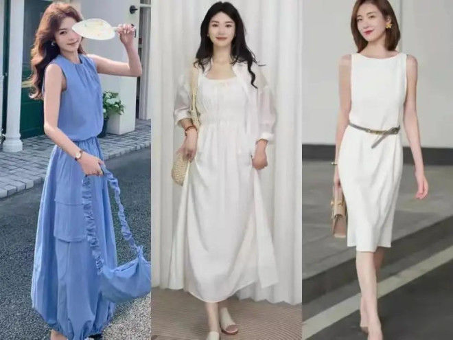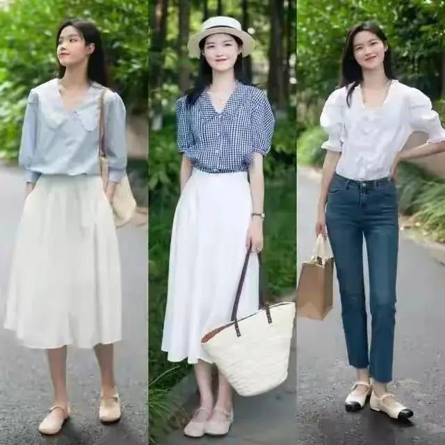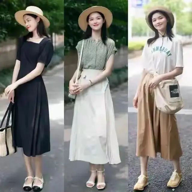 我们选择连衣裙的时候都选高腰收腰款,例如下面这位小个子女性选择的三条裙子都是高腰收腰款的版型,裙子长度正好盖过膝盖到小腿肚的位置,再选择一双棕色的玛丽珍鞋,或者是蓝色的帆布鞋来搭配就够。