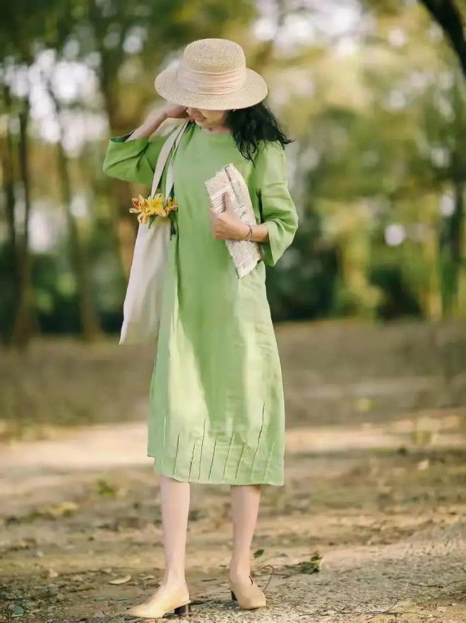 有的时候裙子穿搭并没有想象中那么复杂,选择的款式设计不要过于繁杂,衣服的颜色可以像下面这一条一样,整条裙子是统一色,这样一条连衣裙就搞定了全身,脚上再穿了一双浅口的低跟单鞋,头上戴了一顶草帽,这样的穿衣打扮,谁穿谁美。