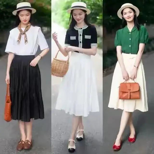 当你换成半身裙的时候,可以把上衣的衣角塞进裙子里面,也能很好的提升腰线,能够使得穿搭者的身材比例变得更协调,脚上可以选黑白拼接的玛丽珍鞋,或者是红色的玛丽珍鞋来穿搭,就能让你变得更加俏皮,显年轻。