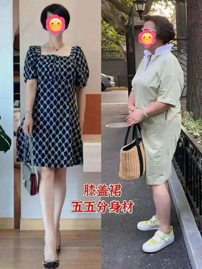 不管你选择的是连衣裙,还是半身裙,裙子长度没有盖过膝盖的话,穿在身上容易让身材形成一个五五分的比例,如果还是发福发胖的身材,那穿出来的效果更老气。
