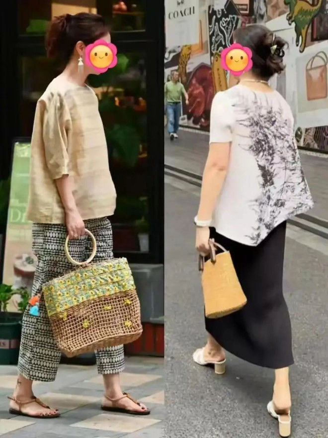 如果选择的衣服很花哨,就算是高颜值的女性也很难驾驭的住,例如下面左边的这一件红色和黄色印花的连衣裙,搭配上一件白色的外套,还有荧光色的丝巾,这样的穿搭并没有时尚感可言。