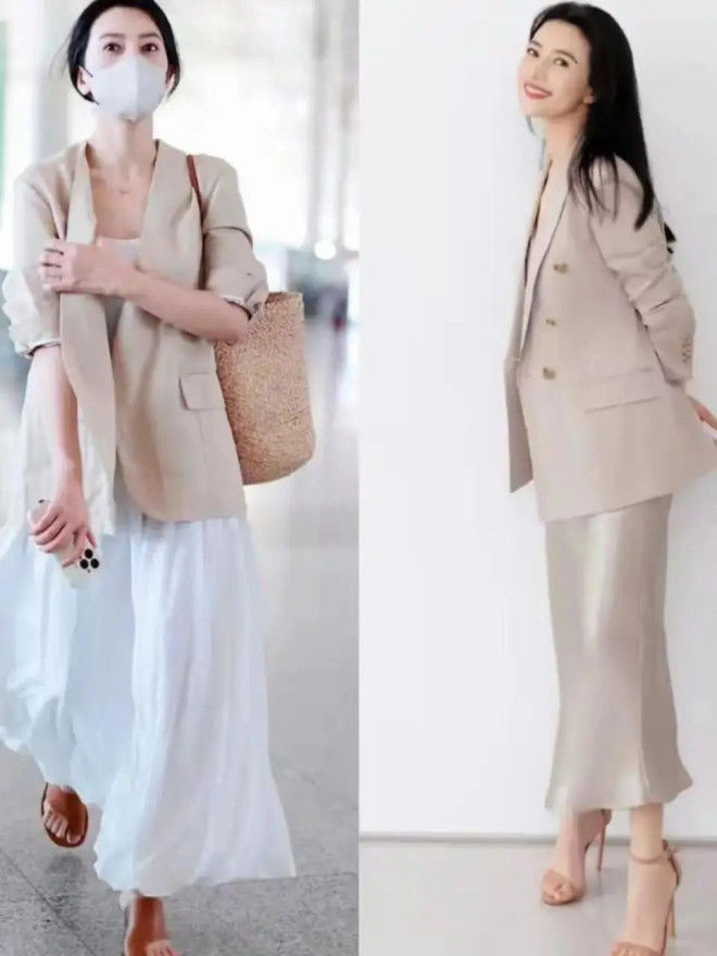 选择用西服外套来搭配上裙子,展现出来的效果确实很干练,高圆圆就选择了一件浅卡其色的西服外套,内搭白T恤,下半身选择一条白色的伞状半身裙,脚上穿了一双棕色的凉拖鞋,这一身穿搭很适合现在的夏季。