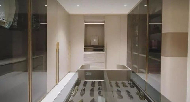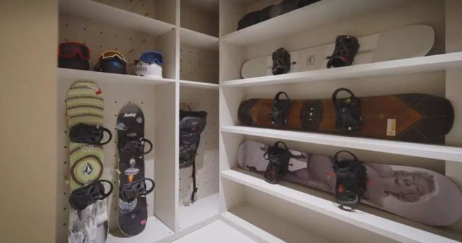 而女明星们最在意的衣帽间被布置的明亮简洁,很有质感,滑雪装备一应俱全。