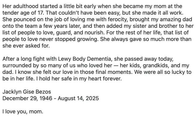 当地时间2024年8月14日,亚马逊创始人、前世界首富杰夫·贝索斯的母亲杰姬·贝索斯(Jackie Bezos)在美国迈阿密家中安详离世,享年78岁。贝索斯在社交媒体发文悼念:“在与路易体痴呆症抗争多年后,我的母亲在众多爱她的人——她的孩子、孙辈以及我父亲的陪伴下,今天平静地离开了我们。”