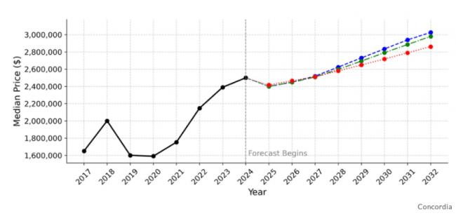 这项研究由康考迪亚大学约翰·莫尔森商学院与投资公司 Equiton 合作完成。研究团队结合传统计量经济学工具与AI预测模型,对温哥华、多伦多等主要城市的房价走势进行了量化模拟。他们在基准模型下发现,即便短期内因移民放缓带来轻微回调,房价仍将在未来数年恢复上行,并于七年后逼近“难以想象的水平”。
