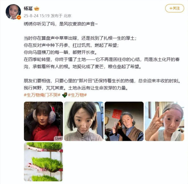 昨天电视剧《生万物》正式收官。8月24日,杨幂发文告别《生万物》和“绣绣”,字里行间都能看出她对这个人物有着很深的理解。