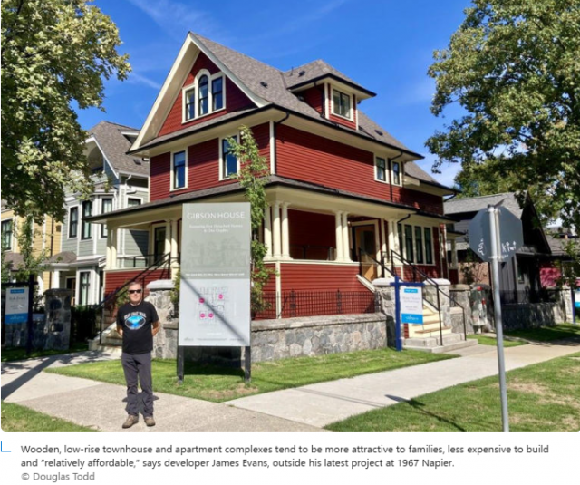 Evans提到最近的一个失败项目:他本想在Kitsilano社区打造一个六户联排小社区,三居室起步,有前庭、有后巷车位。结果因地块合并难度太大、审批周期过长、建安成本过高,项目被迫夭折。