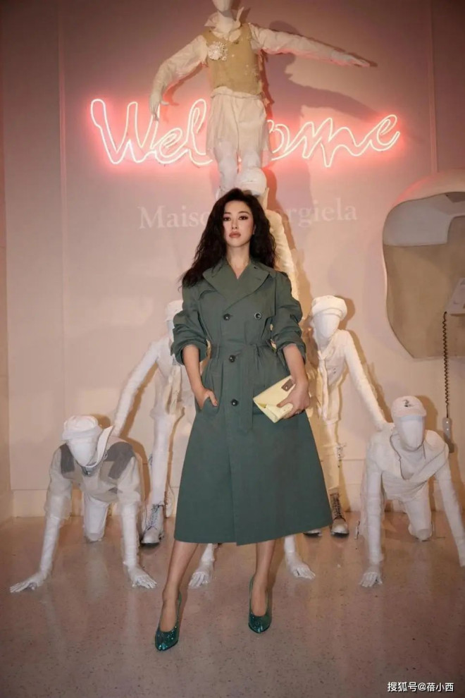风衣和高跟鞋都是绿色款,让我们先将目光投向风衣,其领口是大翻领,扣子是全部扣上的,所以将露肤度降到了最低,很适合秋天户外穿,保暖又洋气十足。三颗大扣子让人一眼就注意到,黑色与绿色视觉上带来强烈碰撞感。衣袖是宽松设计,为了摆pose,挽起了部分,室内不闷热而且多了一丝酷飒。腰带的出现不意外,能有效优化身材比例。脚上是一双恨天高,走起路来霸气十足,鞋子有光泽感,“闪闪发光”的感觉。