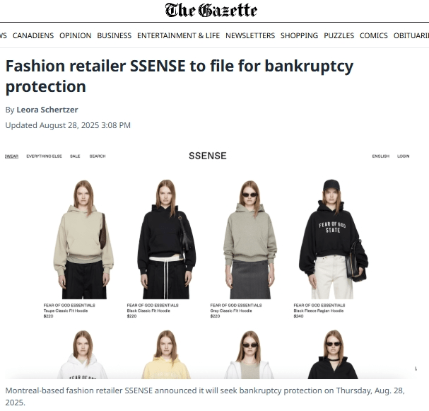 加拿大最具代表性的奢侈品电商平台之一 Ssense,在短短数年内由独角兽企业转而走向财务重组的边缘。该公司正准备根据《公司债权人安排法》(CCAA)申请破产保护,以避免被债权人强制出售。