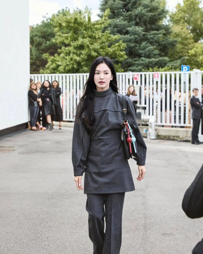 灰色的设计本身就显高级感,抹胸式的内搭凸显性感妩媚。西装设计的外套让性感的基础上又增添了一份干练感。下半身的高腰阔腿裤显腿长的同时还藏肉。这样一身尽显女性的大方优雅,同时宋慧乔选择短发的造型更是点睛一笔,如果换成长发应该就衬托不出这样飒飒的气质了。