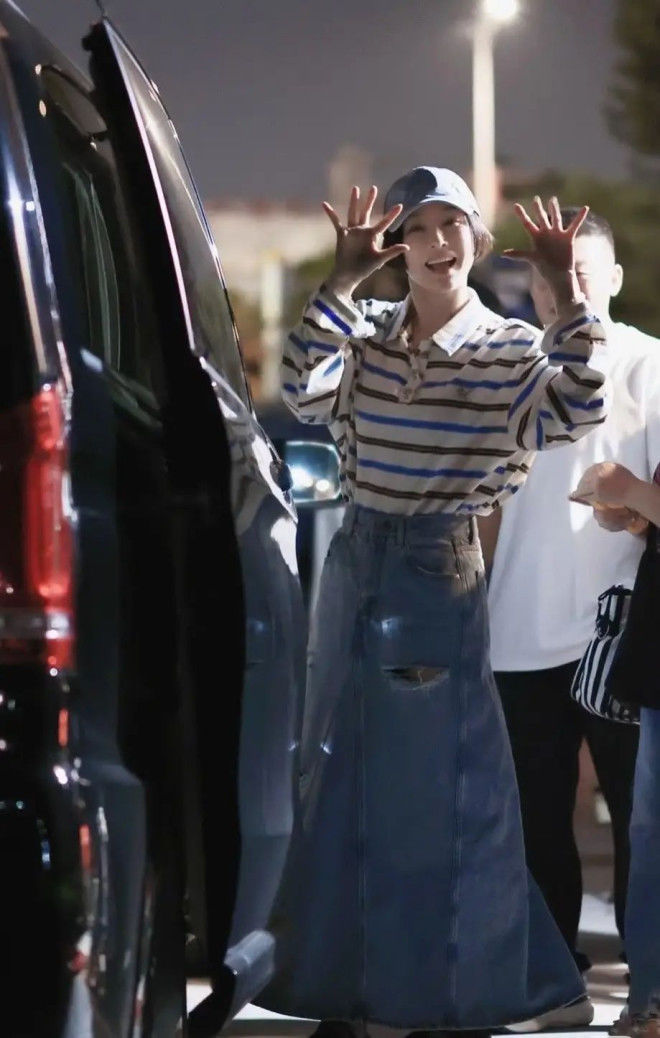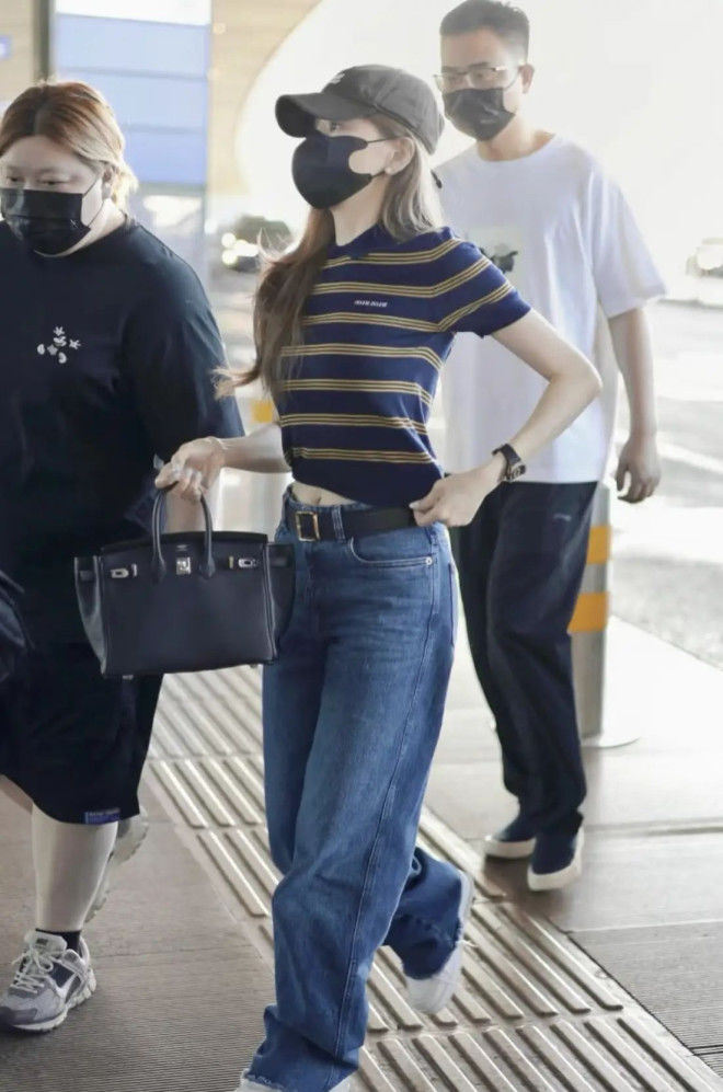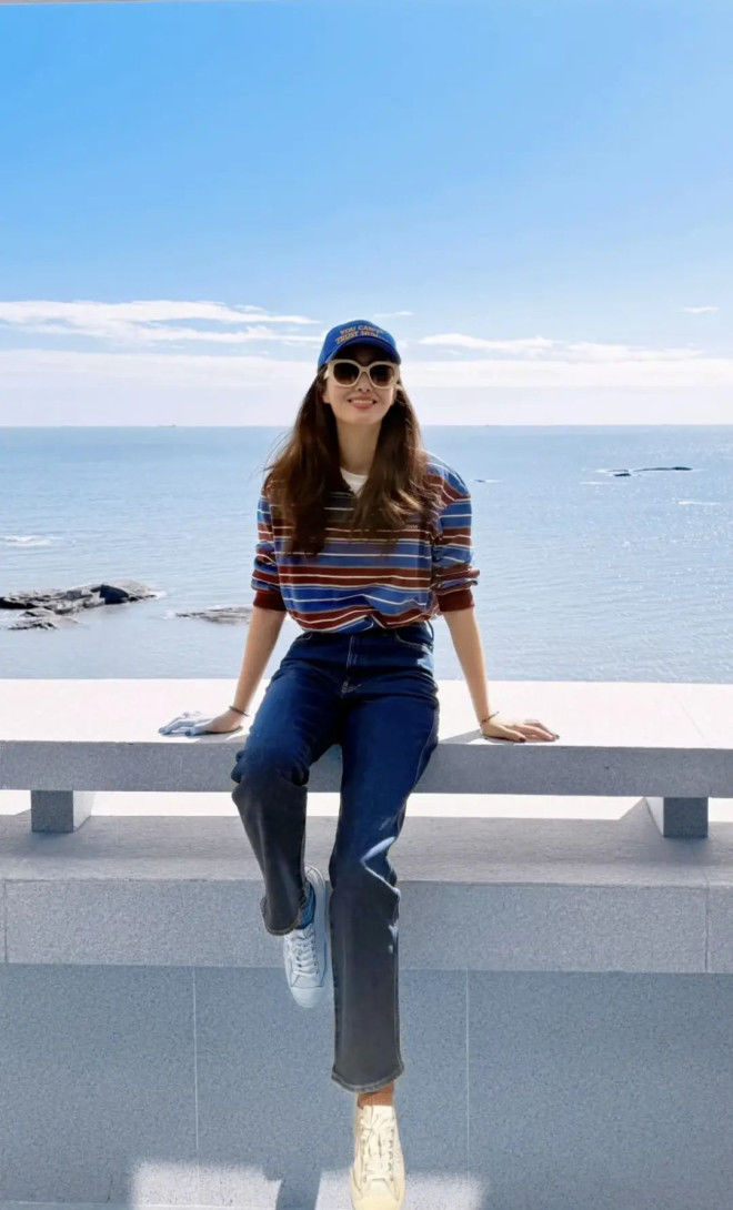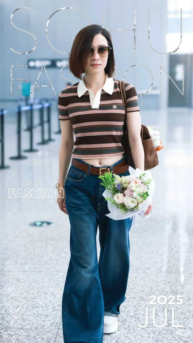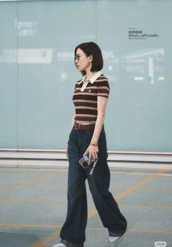 王心凌在机场街拍中,也是同样的搭配方式,Miu Miu的条纹Polo搭配宽腿牛仔,简约又减龄,宽腰带回潮,增添休闲感,一顶棒球帽更添松弛氛围。