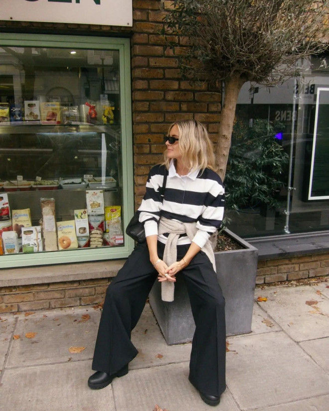 黑白最适合懒人了,不想多花心思配色的话,那基础的黑白条纹Polo配黑色阔腿裤即可,想要活泼点可以配亮色鞋点睛,或者穿一双黑色马丁鞋也是不错的穿法。