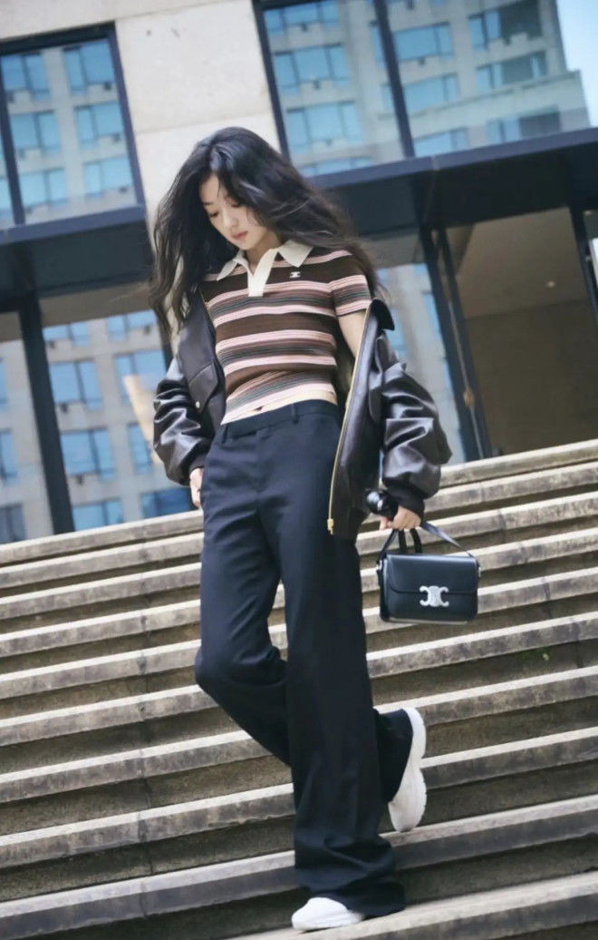 毛晓彤条纹Polo外搭棕色夹克,高度匹配流行的巴恩风,鞋子可以选择与Polo的呼应色,视觉上更和谐。