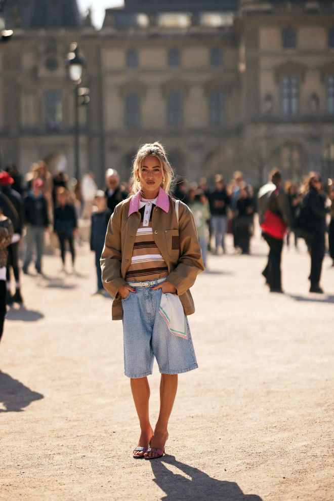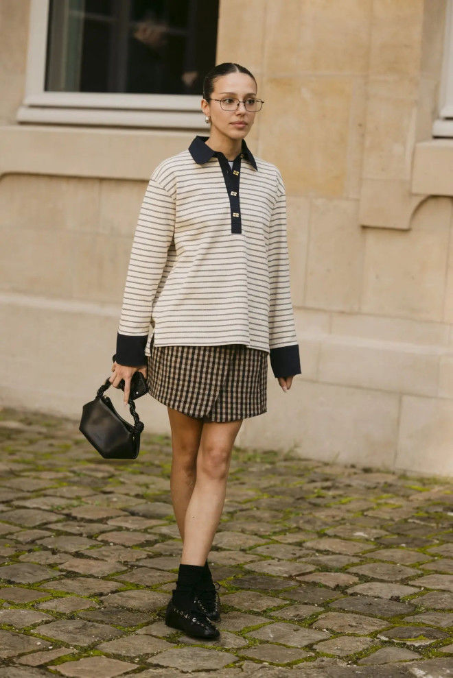 藏青色Polo内搭蓝色系格纹衬衫,是典型的Miu系穿搭,很多平价品牌也可以选类似款打造,搭配宽松短裤,轻松穿成Miu Miu女孩。