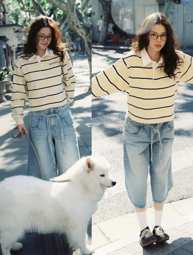 潮Girl欧阳娜娜用一件鹅黄色长袖Polo,搭配现在正流行的宽腿中裤,都是很平常的单品,但组合起来就完全不一样,清新又前卫,牛仔裤的腰带装饰起到点睛之笔。