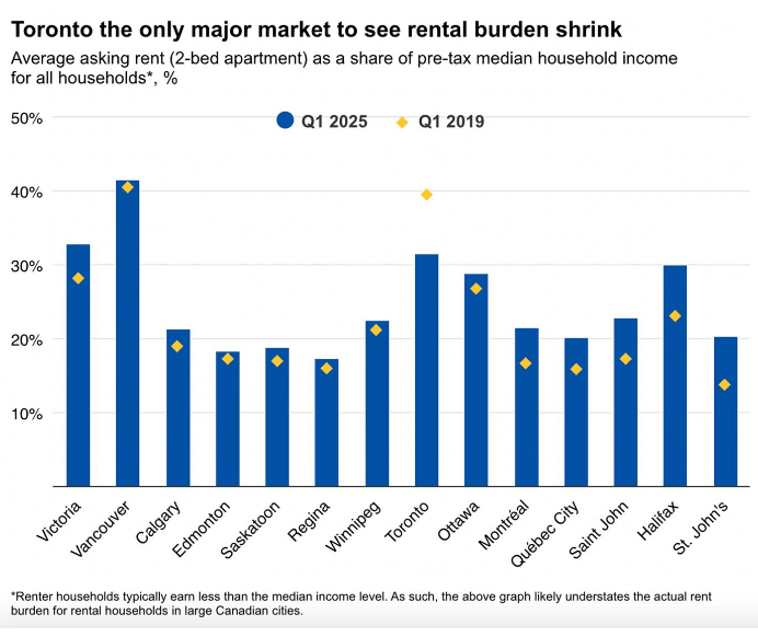 加拿大皇家银行(RBC)在8月发布的一份报告中指出,在全国主要城市中,多伦多是唯一租金负担压力低于疫情前水平的城市。RBC测算,尽管租金仍处于“不可负担”区间(即租金占收入超30%),但压力已有所缓解,堪称“租房者的例外城市”。