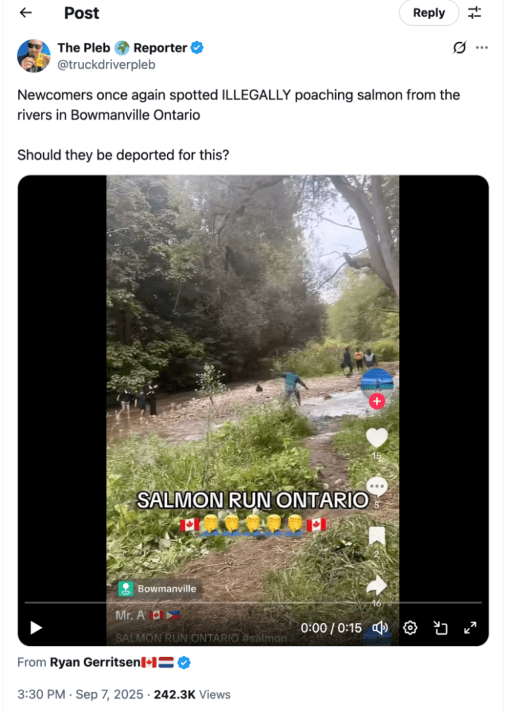 9月7日,一段视频在社交平台上疯传:几位疑似南亚裔男子在浅水区合力将洄游三文鱼赶至河岸,随后迅速抓捕、收进袋中。视频迅速引爆讨论,大量网友指责其行为“野蛮、违法”,更有声音呼吁将涉事者“驱逐出境”。
