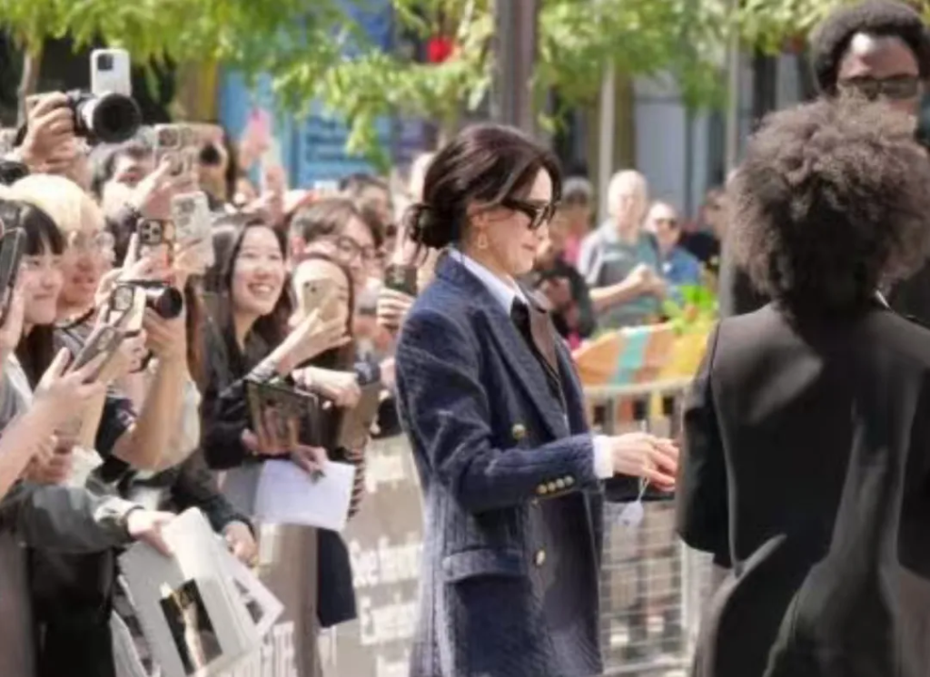 首映当天,她穿着Brunello Cucinelli 2025秋冬系列蓝色西装搭配牛仔裤,佩戴Qeelin耳环,简单、低调,却难掩光芒。她一边走红毯一边签名,粉丝热情呼喊她的名字,却没有人真正意识到,她的光芒来源已然改变。