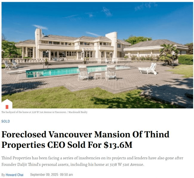 曾是大温哥华房地产市场高层住宅项目的活跃玩家之一,Thind Properties Inc. 如今正经历一场系统性崩溃,从公司旗下多个未售完项目接连进入破产保护,到创始人私人豪宅遭法院强制出售,背后映射出的是资本杠杆的极限与房地产市场失速的真实代价。