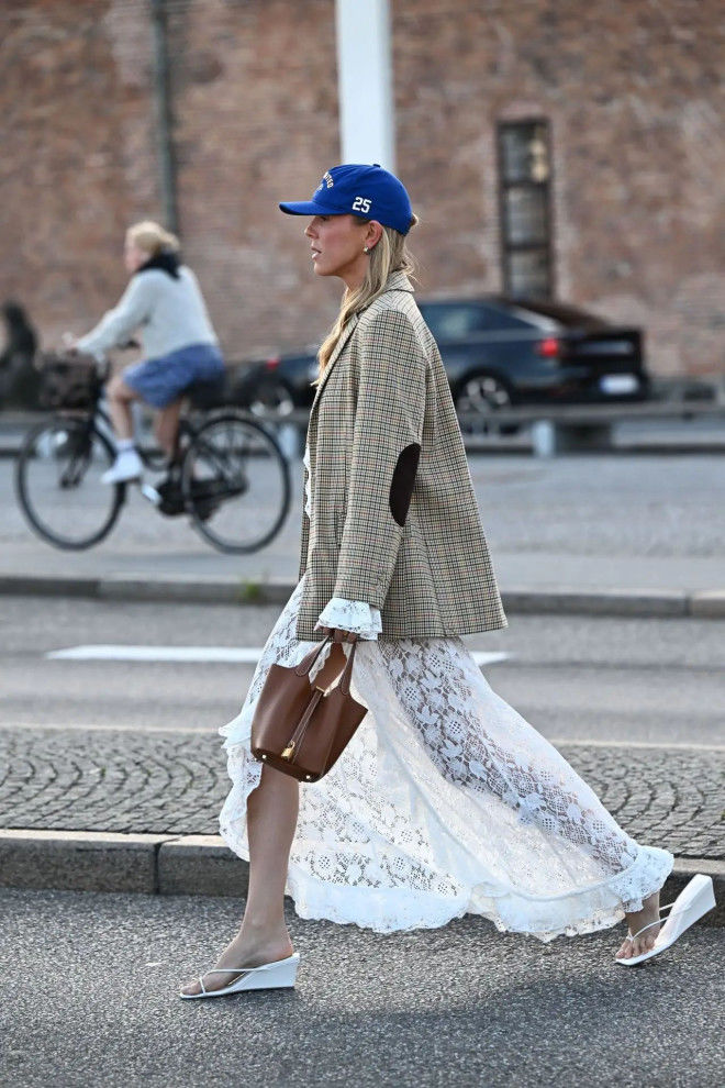 与透视纱裙的混搭竟然也很前卫舒适,搭配棒球帽和运动鞋,给老钱也带来不少青春气息。