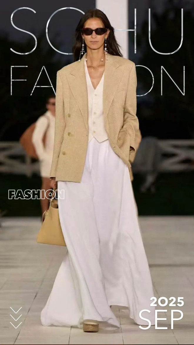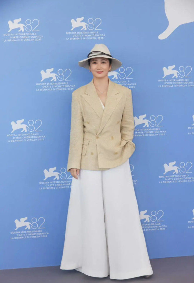 赵涛在威尼斯电影节一身来自Ralph Lauren2025春夏系列米色亚麻双排扣夹克搭配白色裙裤,淡雅色调与简约设计凸显东方美感与高级品味。