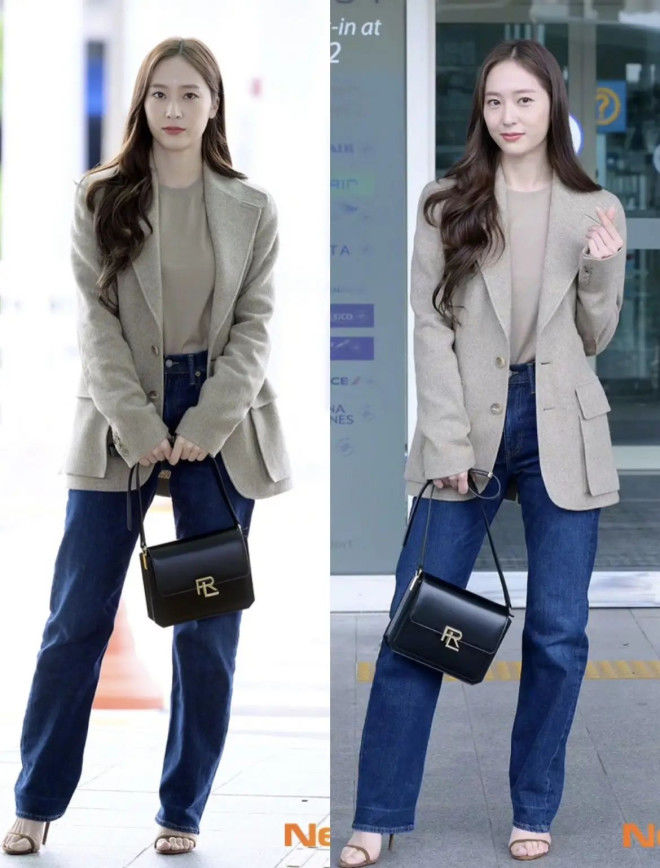 郑秀晶在大片中也pick了这一套,不过她穿出了更日常的feel,红棕色手提包也与整体色调相映成趣。