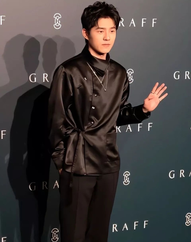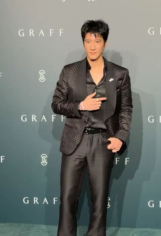 这次他身穿黑色西装,绸缎衬衫解开两颗扣子,尽显型男气质。