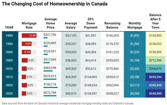 近日,房地产分析网站Zoocasa发布了一份涵盖过去35年加拿大30岁左右年轻家庭购房负担的深度报告。数据揭示出一个令人震惊的现实:尽管2025年房贷利率仅为4.04%,远低于1990年高达13.4%的水平,但年轻购房者背负的还款压力却比当年更大。