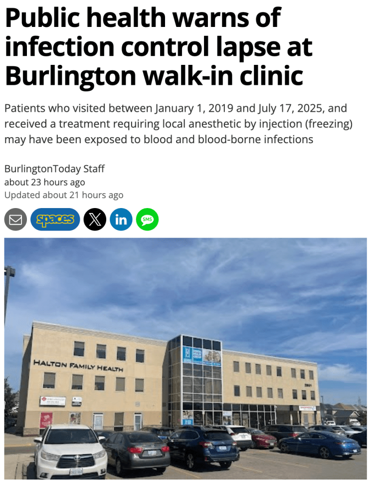 近日,荷顿地区公共卫生局(Halton Region Public Health)紧急发布公告,警告伯灵顿市Halton Family Health Centre的步入式诊所存在严重医疗安全漏洞。自2019年起,该诊所在执行局部麻醉注射操作时,存在重复使用未经消毒针头穿刺多剂量药瓶的行为,涉及时间跨度之久、违规行为之严重,令医疗监管界震惊。