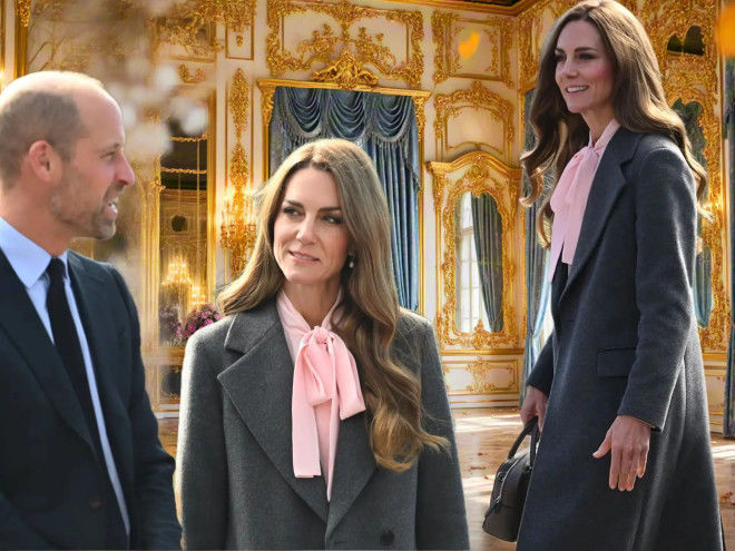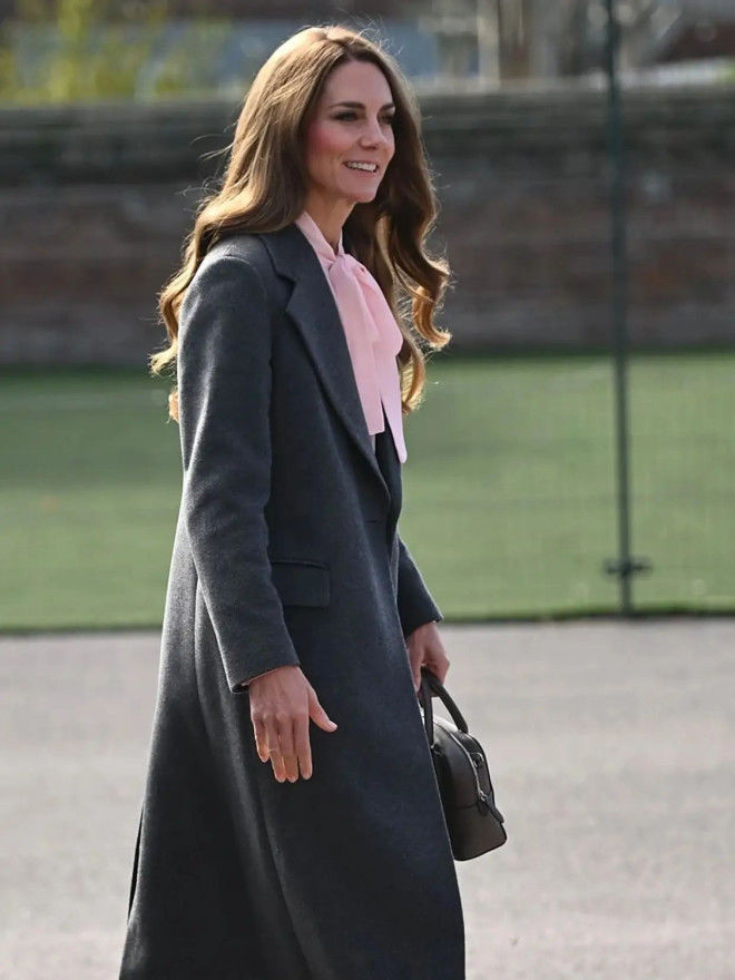 灰色的阔腿裤与同色系长外套相得益彰,外套锋利的翻领和长袖设计,尽显干练与优雅。英国王室成员的时尚品味向来备受瞩目,凯特也不例外。她内搭的粉色丝绸绉绸衬衫,搭配巴宝莉领带,既展现了女性的柔美,又不失端庄大气。