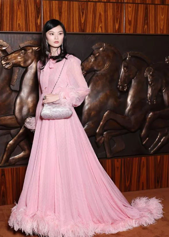 像贺聪这个级别的超模,还真是越素越好看,一身粉色羽毛长裙灵动如同仙女。