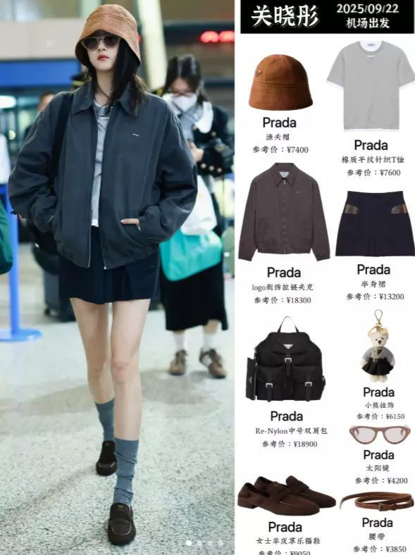 她身穿品牌系列服装,半身裙露出一双修长的美腿,夹克外套和渔夫帽又很有学生气。