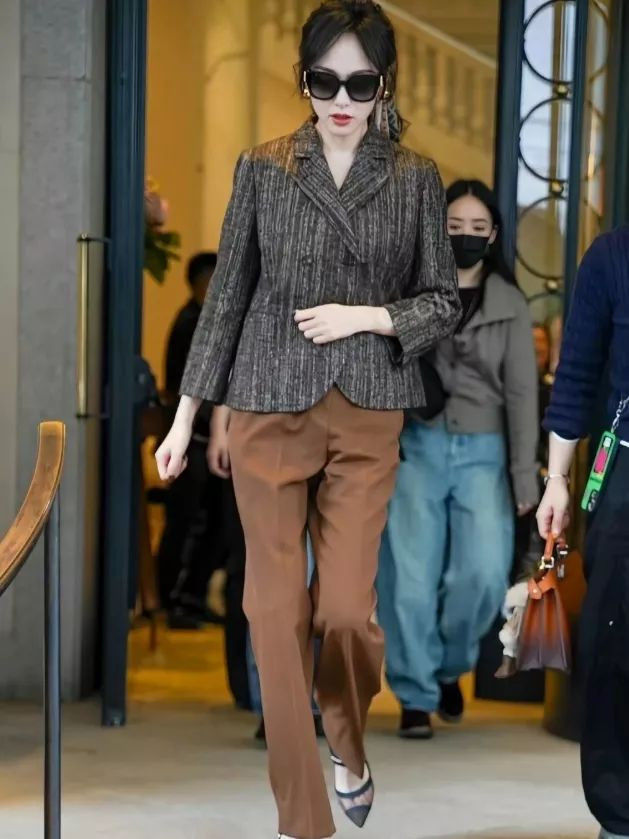 可能大部分人看到她身穿短款西装外套,搭配棕色喇叭裤,会以为唐嫣是把自己奶奶的衣服穿出门了。