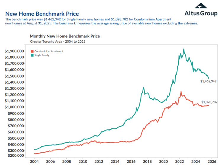 从价格角度来看,新建独立屋基准价为146万加元,较2022年峰值已下滑超过40万加元;公寓基准价保持在102万上下,但市场热度低迷,几无成交。
