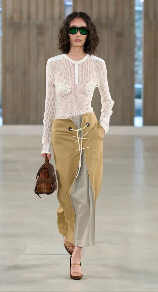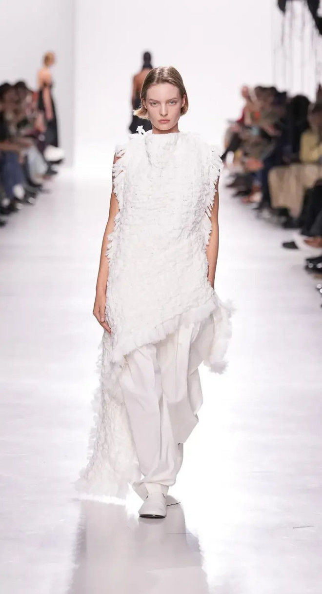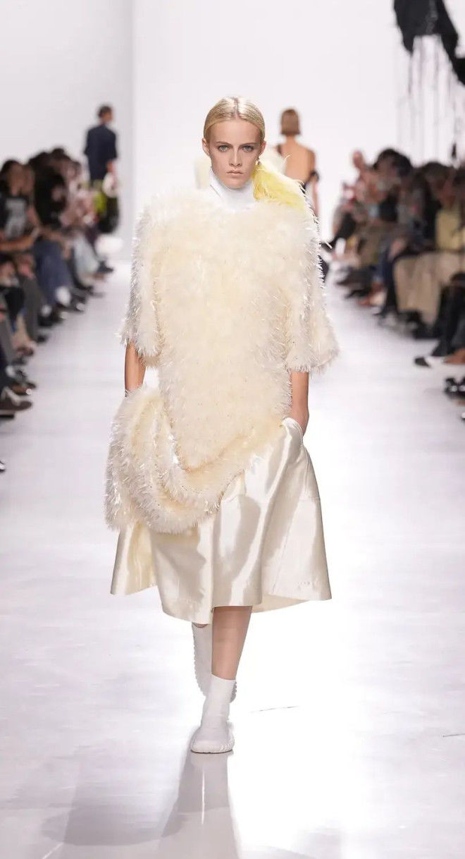 在本次大秀频频出现。从外套到半裙,垂坠飘逸又不失灵动感的细长绳,在各种单品中成为巧妙而生动的时髦。