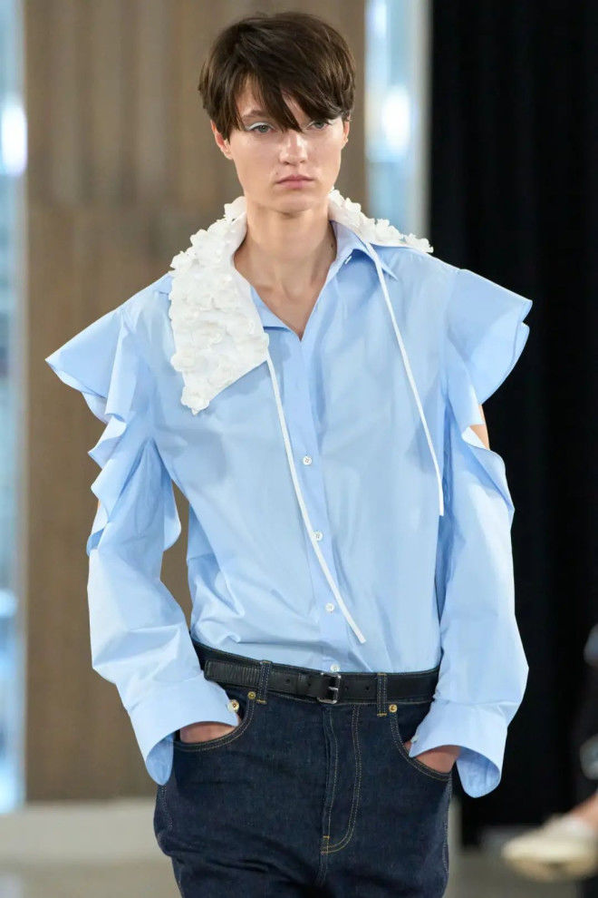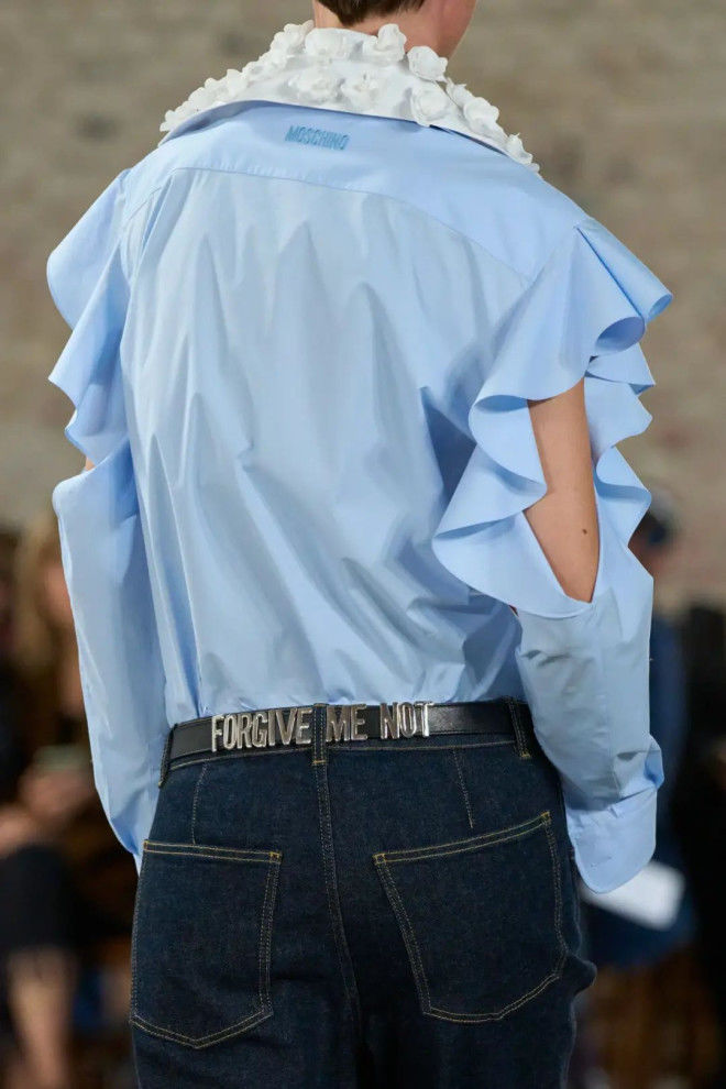 的荷叶边衬衣,令人眼前一亮。不对称的领口,自然垂落的细绳,无不展现Moschino严肃与幽默并存的时尚态度。