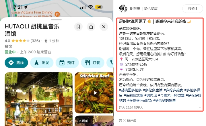 这些店铺并不平凡。它们曾是移民故事的背景墙,是漂泊异乡者寻找归属的温度,也是无数家庭团聚的载体。特别是胡桃里——国内网红品牌在海外的首店,其结合现场音乐与正宗川菜的独特模式,曾点亮多伦多夜生活中最具“文化认同感”的一隅。如今,它们在地产重开发、租约到期、运营压力与消费结构变化的多重夹击下,悄然谢幕。