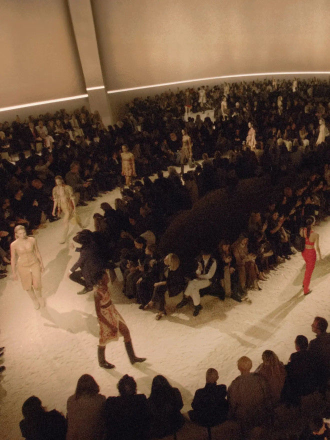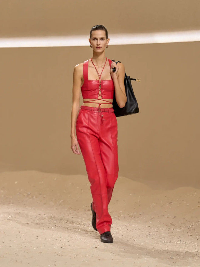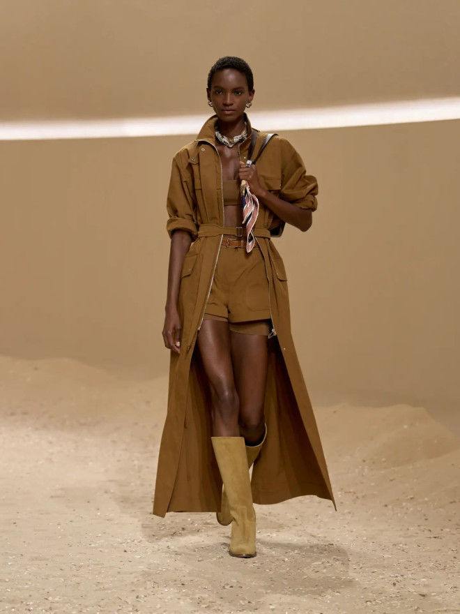 在本季秀场,我们仿佛看到了无垠地平线和开阔视野于风塑景致中徐徐展开,河流与海洋的无尽潮汐雕琢出三角洲地貌。卡马尔格湿地的色彩启发,化作了一组充满生机与诗意的色彩体系。橙、蓝、红等明亮色调贯穿整个系列,既呼应了湿地的自然生机,又为都市女性注入活力。